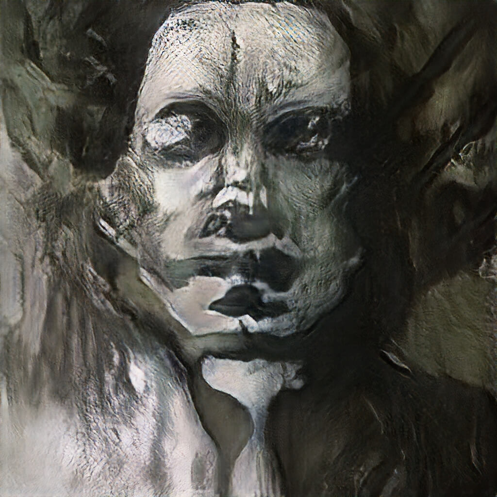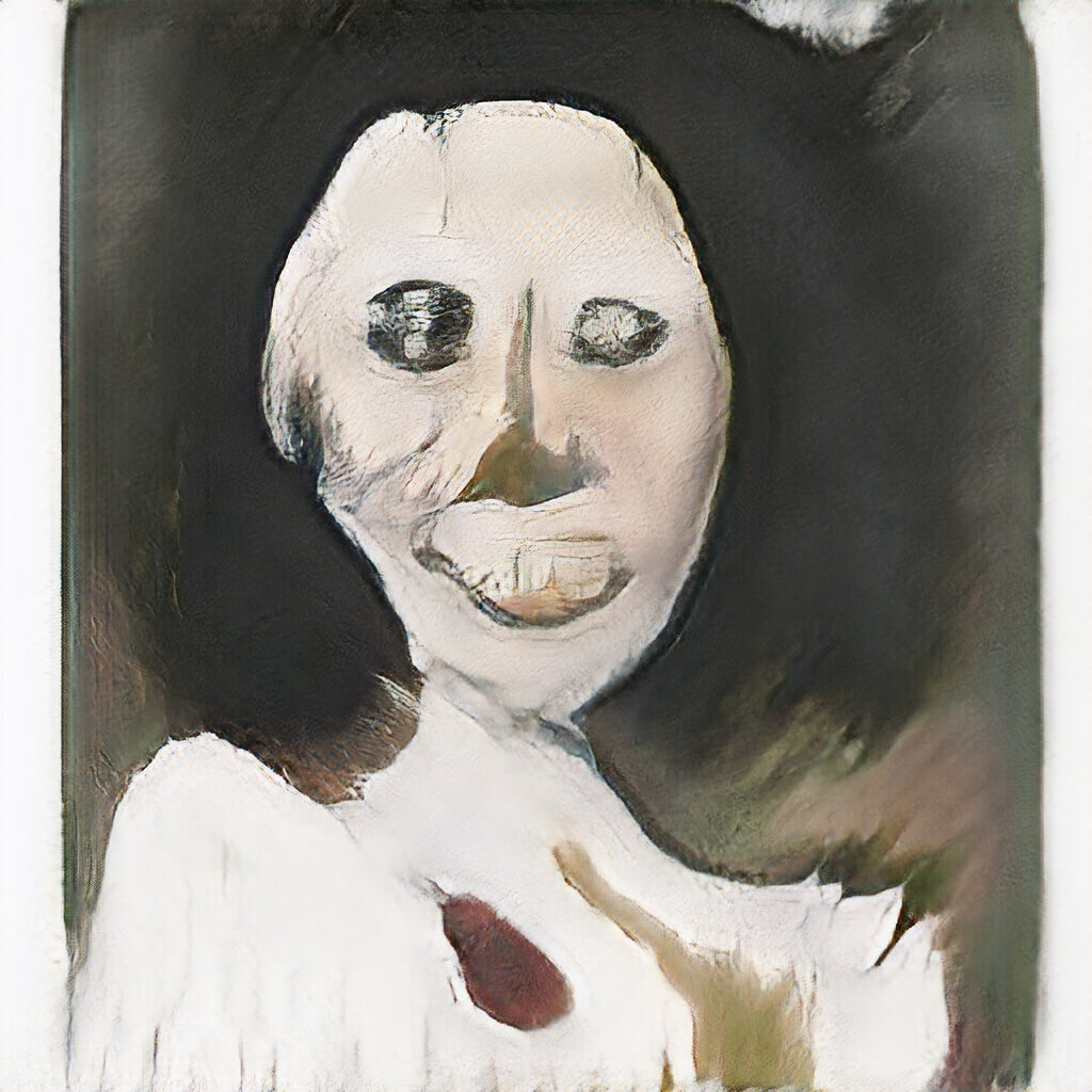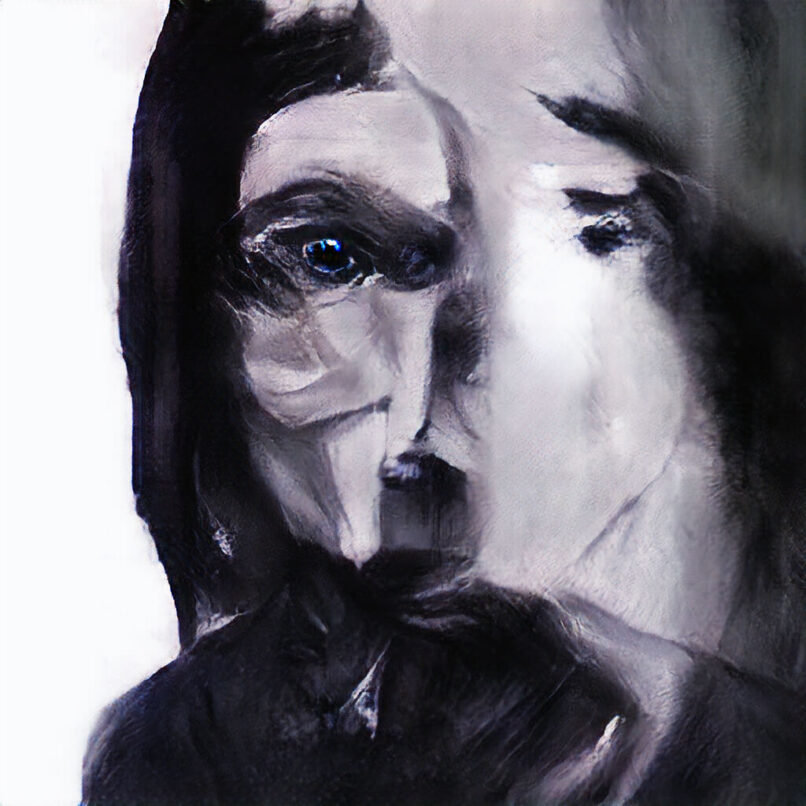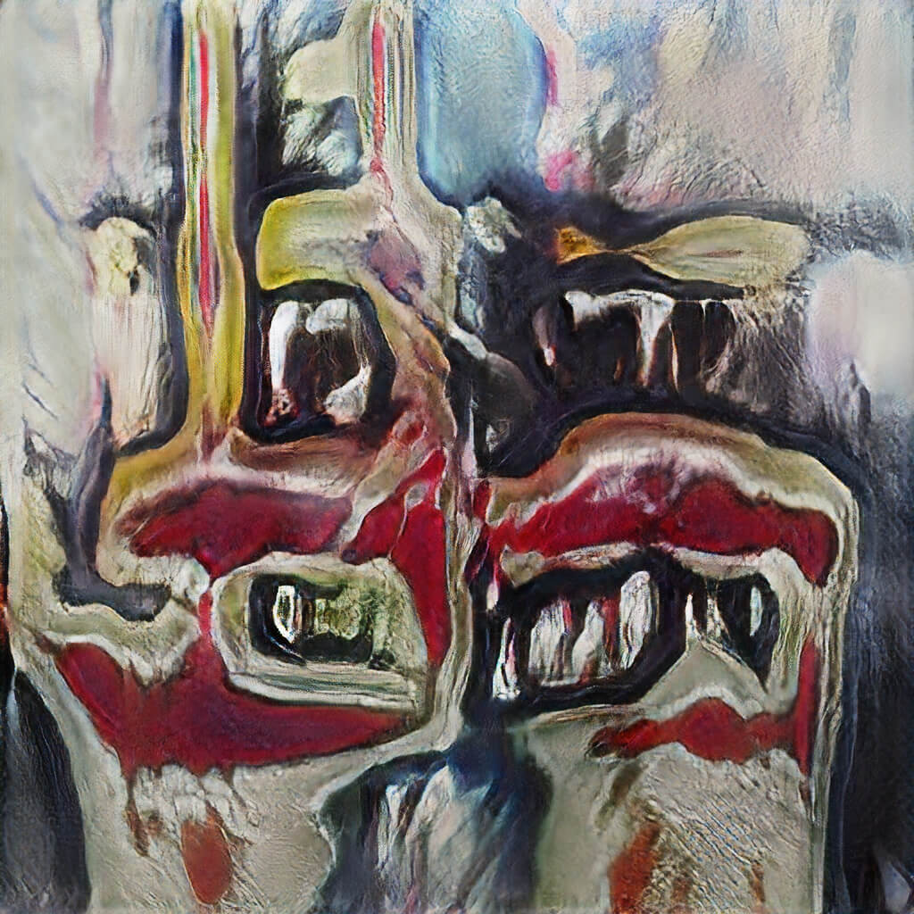 A selection of face-like outputs in different artificial intelligence models as a result of training experiments with the machine learning methods (GANs), using a dataset created with images of paintings, mostly made with oil paint. An interpolation loop video was made from the images generated and some of these images were digitally printed on 32cm x 32cm canvas.